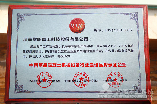 經主辦單位廣泛調查以及評審專家組嚴格評審,黎明重工2017-2018年度重視品牌建設的突出表現,在中國商品混凝土行業企業專家委員會第四屆第二次會議上,黎明重工獲得“中國商品混凝土機械設備行業最佳品牌示范單位”。