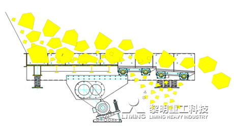 TSW給料機慣性式雙偏心軸激振器能產(chǎn)生定向激振力。兩軸之間有一對傳動比為1的齒輪副連接,保障其回轉方向相反,轉速相等。通過電動機驅動,兩偏心軸旋轉,由于兩軸上的偏心質量和偏心距大小相等,所產(chǎn)生的慣性力在一個方向互相抵消,而在另一個方向互相疊加,從而合成的定向激振力,使與此激振器剛性連接的給料槽體在支承彈簧上做強制振動,物料在振動力的作用下,在料槽上作滑動及拋擲運動,從而使物料前移而達到給料目的。當物料通過槽體上的蓖條時,較小的物料通過蓖條之間的間隙落下直接進入下道破碎工序,從而起到預篩分效果,保障破碎設備的破碎效率及能力。