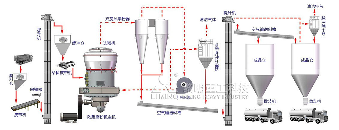 無論是采用爐內(nèi)脫硫還是采用爐外煙氣脫硫的脫硫方式,均需要磨制不同粒級(jí)的石灰石粉。根據(jù)CFB鍋爐的脫硫特點(diǎn),黎明重工研發(fā)出一種新型的脫硫制粉設(shè)備和工藝。在原來僅對(duì)爐外煙氣脫硫石粉的工藝擴(kuò)展為同時(shí)生產(chǎn)爐內(nèi)和爐外兩種粒級(jí)的石粉同時(shí)制備的新工藝。